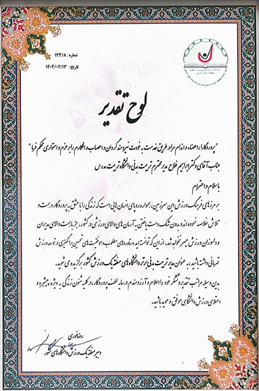 مدیر تربیت بدنی دانشگاه تربیت مدرس عنوان مدیر تربیت بدنی برتر دانشگاه‌های منطقه یک ورزش کشور را کسب کرد.