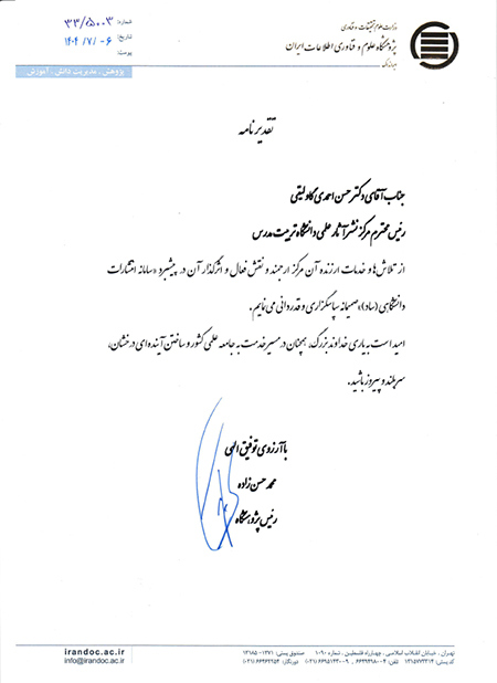 تقدیر از مرکز نشر آثار علمی دانشگاه تربیت مدرس در پژوهشگاه علوم و فناوری اطلاعات ایران (ایرانداک)