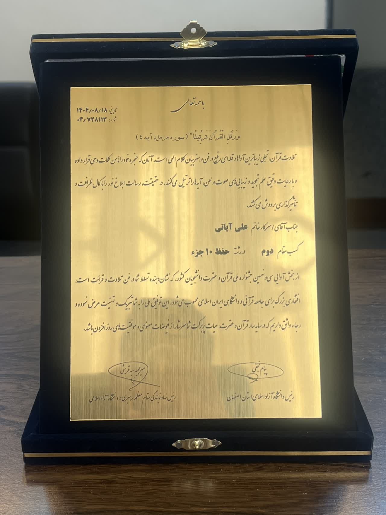 علی آیاتی حافظ بین المللی و صاحب مقام های متعدد کشوری در رشته حفظ قران کریم ؛ به عنوان نماینده قرآنی دانشگاه تربیت مدرس توانست در بخش آوایی این مسابقات رتبه دوم را در رشته حفظ ۱۰ جزء قرآن کریم کسب کند.
