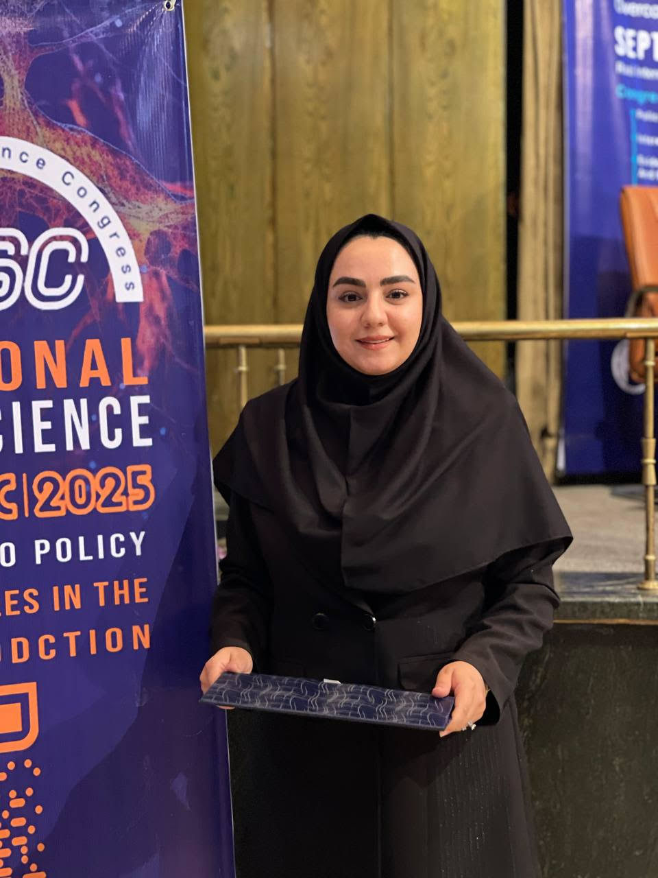 وی با ارائه پژوهش خود با عنوان  'Quantitative Analysis of Methamphetamine in Lucilia sericata (Diptera: Calliphoridae) via Liquid–Liquid Extraction and GC–MS'
