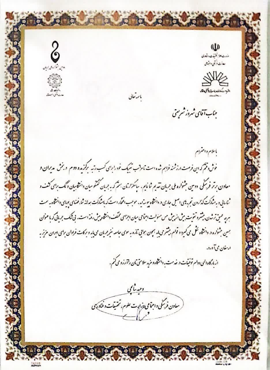 در این جشنواره، دکتر شهروز شریعتی، عضو هیأت علمی دانشکده علوم انسانی و مدیر اجتماعی و تشکل‌های دانشگاه تربیت‌ مدرس، از سوی هیأت داوران در بخش «معاونان و مدیران فرهنگی و اجتماعی» کشور به‌عنوان مدیر برگزیده کشور معرفی شد.
