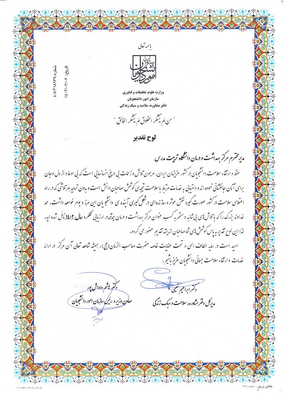 در سیزدهمین گردهمایی مدیران مراکز بهداشت و درمان دانشگاه‌های سراسر کشور که ۵ تا ۷ اردیبهشت ماه سال جاری در دانشگاه سیستان و بلوچستان برگزار شد، مرکز سلامت و بهداشت دانشگاه تربیت مدرس به عنوان مرکز برتر (در گروه جمعیتی ۵ تا ۱۰ هزار دانشجو) در ارزیابی سال ۱۴۰۲ انتخاب و معرفی شد.