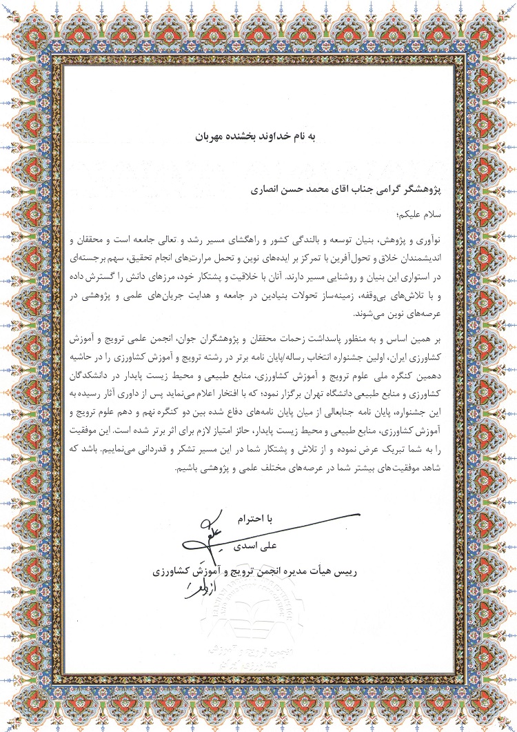 پایان نامه محمد حسن انصاری دانش آموخته دانشگاه به عنوان پایان نامه برتر کشور در «دهمین کنگره ملی ترویج و آموزش کشاورزی، منابع طبیعی و محیط زیست پایدار» انتخاب و تقدیر شد.