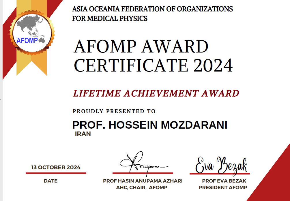 فدراسیون انجمن‌های فیزیک پزشکی کشورهای منطقه آسیا و اقیانوسیه (AFOMP) متشکل از انجمن‌های ۱۸ کشور و با قریب به ۱۰۰۰۰ عضو، ‌ دکتر حسین مزدارانی عضو هیات علمی دانشکده علوم پزشکی را از بین بیش از  ۴۰ نامزد معرفی شده در سال جاری برای جایزه دستاورد علمی طول عمر (Lifetime Achievement Award) به پاس بیش از ۳۰ سال فعالیت تحقیقاتی و گسترش علم رادیوبیولوژی در ایران و کشورهای منطقه آسیا و اقیانوسیه برگزید.