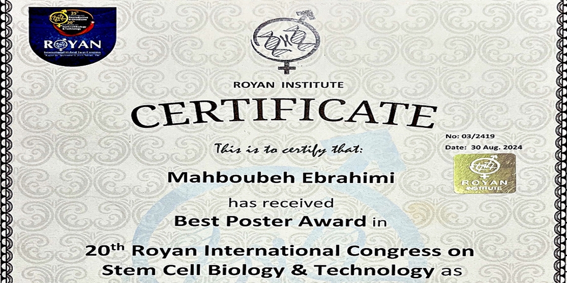 محبوبه ابراهیمی ورکیانی، دانشجوی مقطع دکتری رشتۀ علوم سلولی کاربردی دانشکده علوم پزشکی دانشگاه تربیت مدرس  در بیستمین کنگرۀ بین‌ المللی فناوری سلول‌ های بنیادی پژوهشگاه رویان  (20th Royan International Congress on Stem Cell Biology and Technology)   رتبۀ اول ارائۀ پوستر (Best Poster Award) را کسب کرد. گفتنی است بیست و پنجمین کنگره بین المللی پزشکی تولید مثل و بیستمین کنگره فناوری سلول‌ های بنیادی، ۷ تا ۹ شهریور ماه ۱۴۰۳ توسط پژوهشگاه رویان جهاد دانشگاهی در تهران برگزار شد.