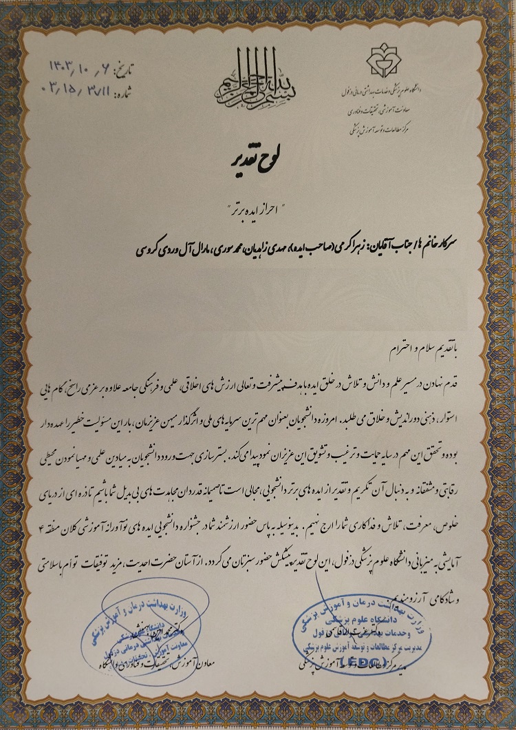 زهرا کرمی و مارال اله وردی دانشجویان گروه انفورماتیک پزشکی دانشگاه در جشنواره دانشجویی ایده‌های نوآورانه آموزشی کلان منطقه چهار موفق به کسب عنوان ایدهٔ برتر شدند. گفتنی است در این جشنواره که در دانشگاه علوم پزشکی دزفول برگزار شد، ۴۱ ایده نوآورانه در ۶ حیطه تخصصی ارائه گردید و از این میان ۱۲ ایده به عنوان ایده برتر شناخته و معرفی شدند.