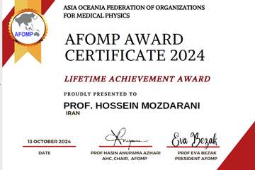 فدراسیون انجمنهای فیزیک پزشکی کشورهای منطقه آسیا و اقیانوسیه (AFOMP) متشکل از انجمنهای ۱۸ کشور و با قریب به ۱۰۰۰۰ عضو، دکتر حسین مزدارانی عضو هیات علمی دانشکده علوم پزشکی را از بین بیش از ۴۰ نامزد معرفی شده در سال جاری برای جایزه دستاورد علمی طول عمر (Lifetime Achievement Award) به پاس بیش از ۳۰ سال فعالیت تحقیقاتی و گسترش علم رادیوبیولوژی در ایران و کشورهای منطقه آسیا و اقیانوسیه برگزید.