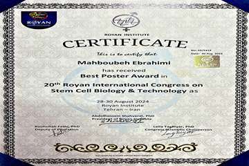 محبوبه ابراهیمی ورکیانی، دانشجوی مقطع دکتری رشتۀ علوم سلولی کاربردی دانشکده علوم پزشکی دانشگاه تربیت مدرس  در بیستمین کنگرۀ بین‌ المللی فناوری سلول‌ های بنیادی پژوهشگاه رویان  (20th Royan International Congress on Stem Cell Biology and Technology)   رتبۀ اول ارائۀ پوستر (Best Poster Award) را کسب کرد. گفتنی است بیست و پنجمین کنگره بین المللی پزشکی تولید مثل و بیستمین کنگره فناوری سلول‌ های بنیادی، ۷ تا ۹ شهریور ماه ۱۴۰۳ توسط پژوهشگاه رویان جهاد دانشگاهی در تهران برگزار شد.