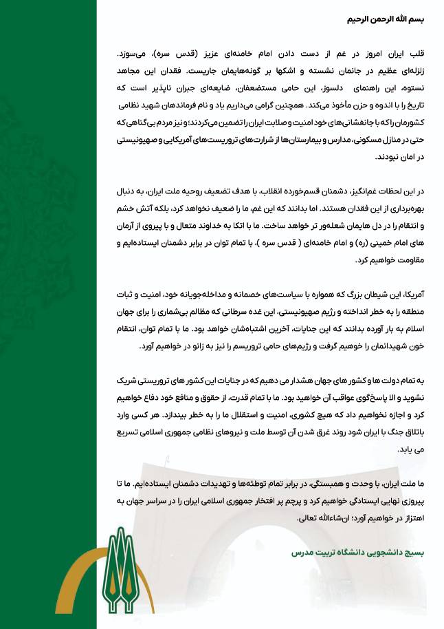 در این لحظات غم‌انگیز، دشمنان قسم‌خورده انقلاب، با هدف تضعیف روحیه ملت ایران، به دنبال بهره‌برداری از این فقدان هستند. اما بدانند که این غم، ما را ضعیف نخواهد کرد، بلکه آتش خشم و انتقام را در دل‌هایمان شعله‌ورتر خواهد ساخت. ما با اتکا به خداوند متعال و با پیروی از آرمان‌های امام خمینی (ره) و امام خامنه‌ای، با تمام توان در برابر دشمنان ایستاده‌ایم و مقاومت خواهیم کرد.