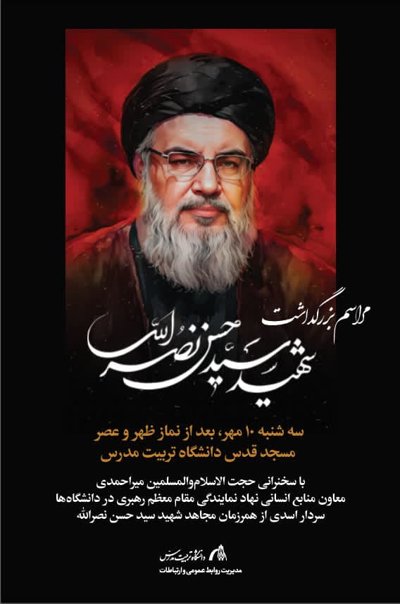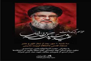مراسم بزرگداشت مجاهد شهید سید حسن نصرالله، سه شنبه 10 مهر ماه بعد از نماز ظهر و عصر در مسجد قدس دانشگاه برگزار می شود.