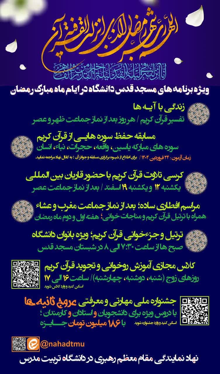نهاد نمایندگی مقام معظم رهبری در دانشگاه، برنامه های مسجد قدس را در ایام ماه مبارک رمضان اعلام کرد.