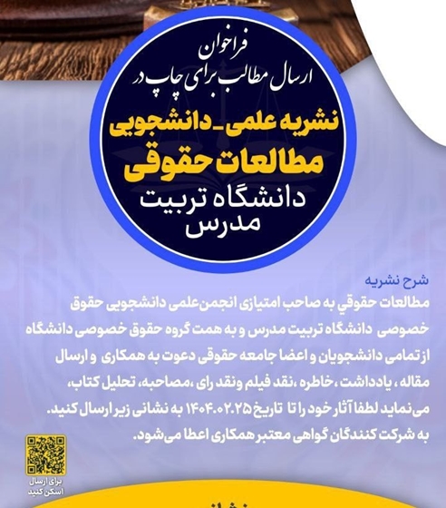 نشریه مطالعات حقوقی به صاحب امتیازی انجمن علمی حقوق دانشگاه تربیت مدرس از تمامی دانشجویان و پژوهشگران و اعضای جامعه حقوقی دعوت به عمل می‌‌آورد که مطالب خود را در قالب مقاله، یادداشت، ترجمه، مصاحبه، نقد و تحلیل رای، فیلم و کتاب تا تاریخ ۲۵ اردیبهشت ۱۴۰۴ به نشانی azam.lotfineyestanak@modares.ac.ir ارسال نمایند.