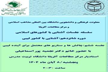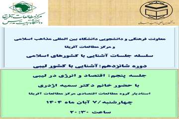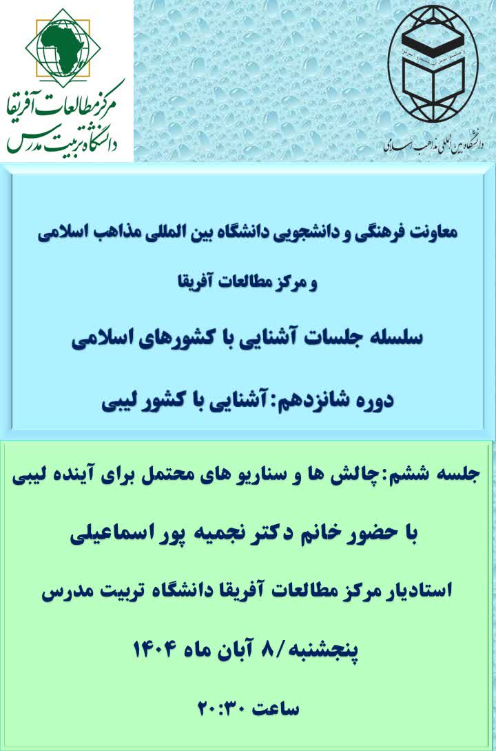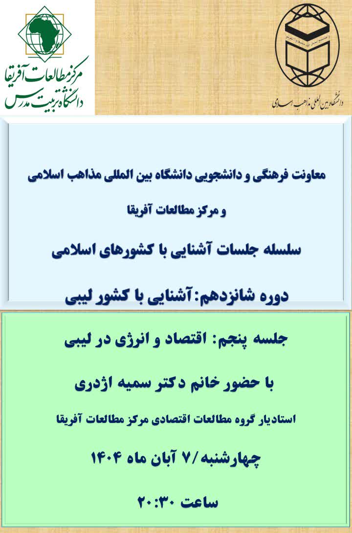 سلسله کارگاه‌های تخصصی با هدف آشنایی با ساختار سیاسی و تحولات اقتصادی، چالش‌های انرژی و فرصت‌های توسعه در کشور لیبی با موضوع‌های وضعیت لیبی از 2011 تا کنون و نیز چالشها و سناریوهای محتمل برای آینده‌ی لیبی توسط خانم دکتر نجمیه پوراسماعیلی و نیز تحلیل اقتصاد و انرژی در لیبی توسط دکتر سمیه اژدری، به ترتیب اعضای هیأت علمی علوم سیاسی و علوم اقتصادی مرکز مطالعات آفریقا، برای اعضای هیأت علمی، کارکنان و نیز دانشجویان داخلی و بین الملل دانشگاه مذاهب اسلامی برگزار شد.