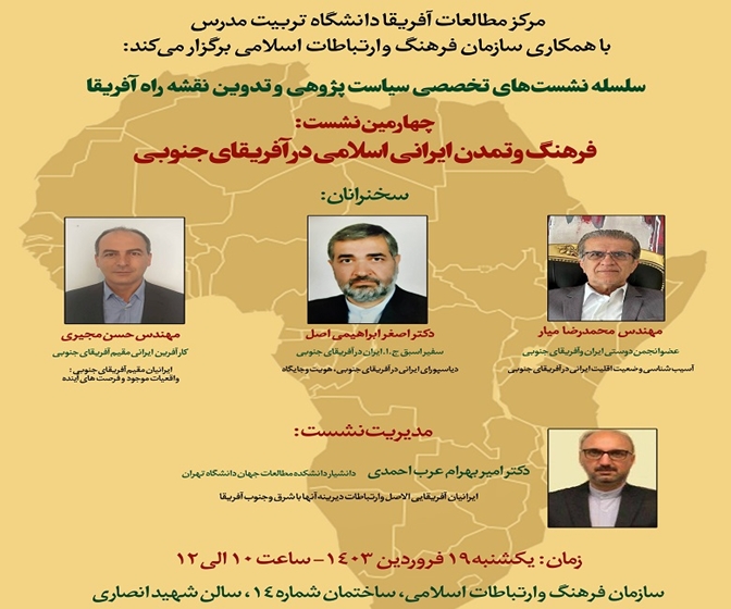 مرکز مطالعات آفریقای دانشگاه تربیت مدرس با همکاری سازمان فرهنگ و ارتباطات چهارمین نشست از سلسله نشست های تخصصی « سیاست پژوهی و تدوین نقشه راه آفریقا» با عنوان «فرهنگ و تمدن ایرانی اسلامی در آفریقای جنوبی» را روز یکشنبه ۱۹ فروردین ۱۴۰۳ برگزار می کند.