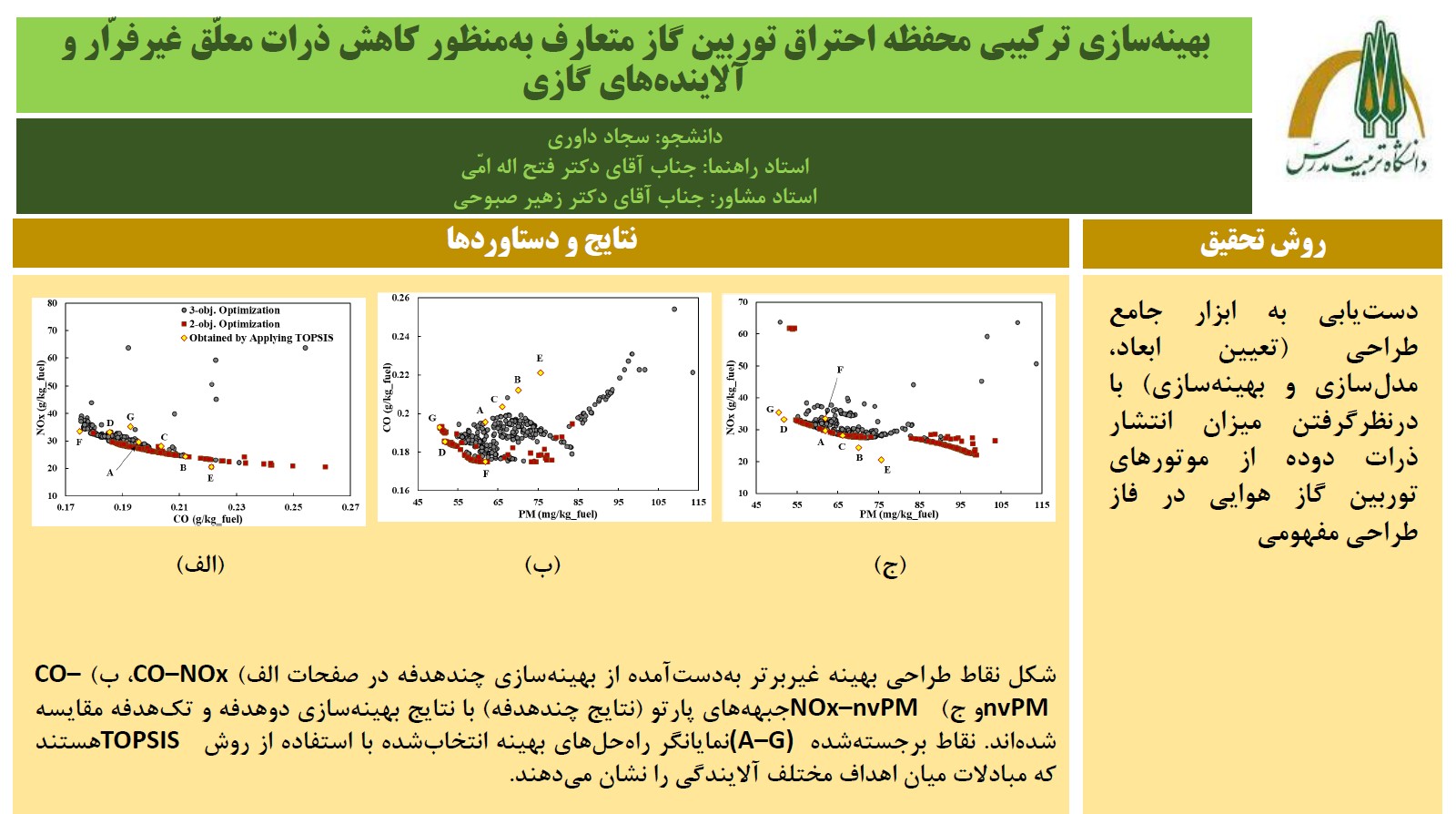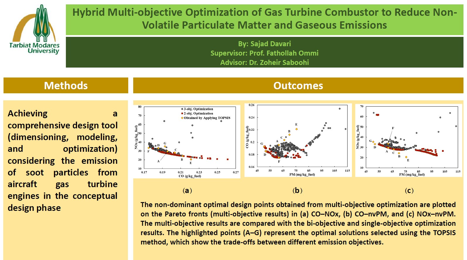 هدف از این فرایند، ارتقای عملکرد احتراقی و حرارتی محفظه احتراق و درعینحال کاهش آلایندهها، بهویژه ذرات معلق غیرفرار (nvPM)، است. بهمنظور انتخاب راهحل نهایی بهینه، روش تصمیمگیری چندمعیاره TOPSIS (تکنیک اولویتبندی بر اساس شباهت به راهحل ایدهآل) به کار گرفته میشود. نتایج نشان میدهد که با این رویکرد، آلایندههای CO تا 7.1%، NOx تا 4.9% و nvPM تا 16% نسبت به مقادیر اولیه کاهش مییابند. این دستاورد میتواند گامی مهم در توسعه محفظههای احتراق توربین گاز با راندمان بالاتر و آلایندگی کمتر باشد. این رویکرد و نتایج آن بر اساس دادههای موتور CFM56-7B27 ارزیابی و اعتبارسنجی شدهاند.