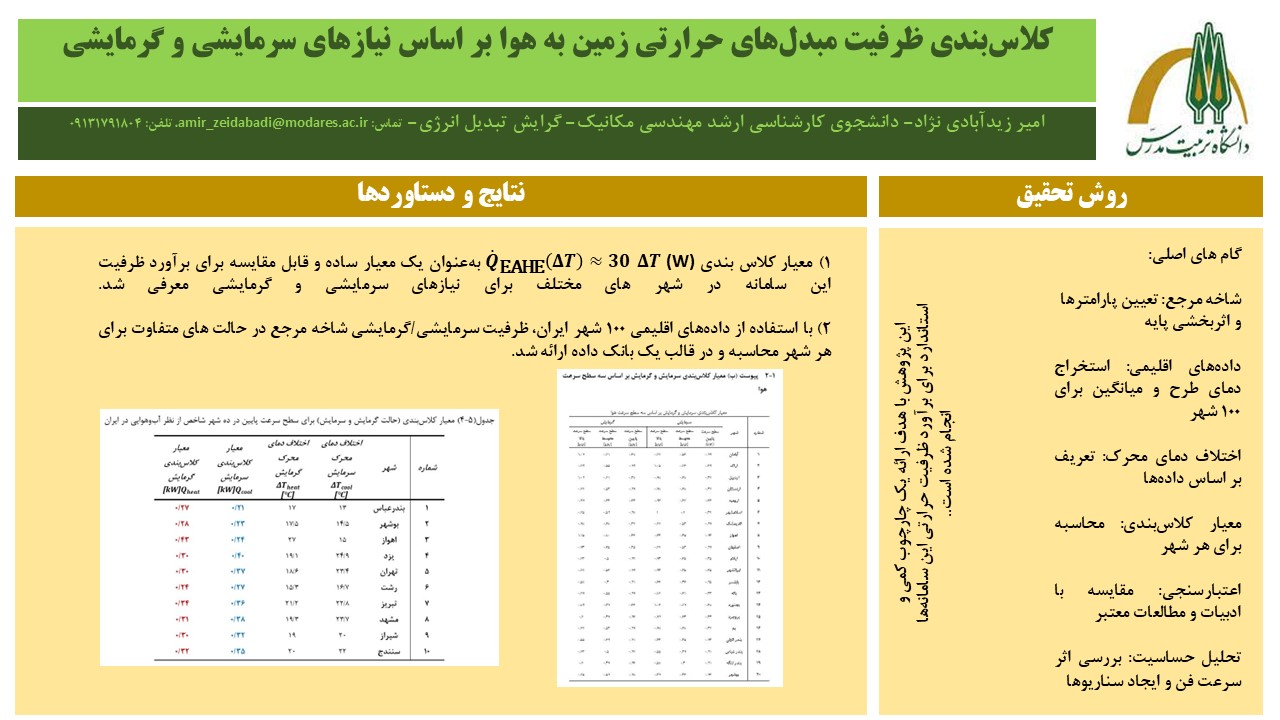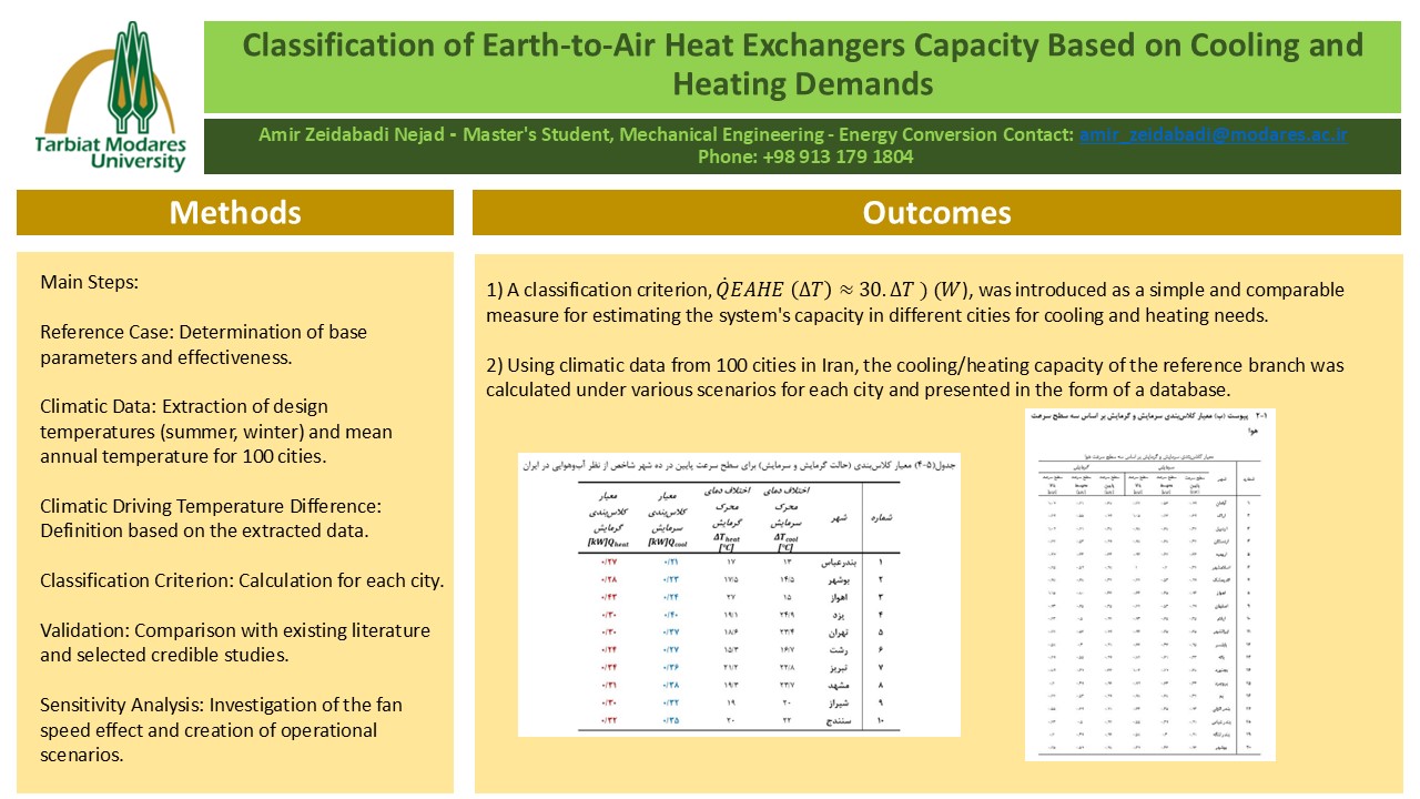 جلسه دفاع پایان نامه امیر زیدآبادی نژاد با عنوان «کلاسبندی ظرفیت مبدلهای حرارتی زمین به هوا بر اساس نیازهای سرمایشی و گرمایشی» 5 بهمن 1404 برگزار می شود.