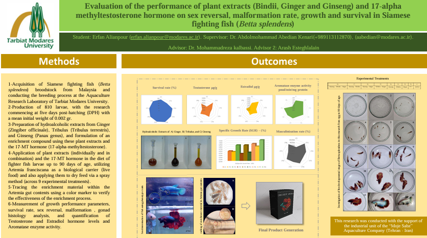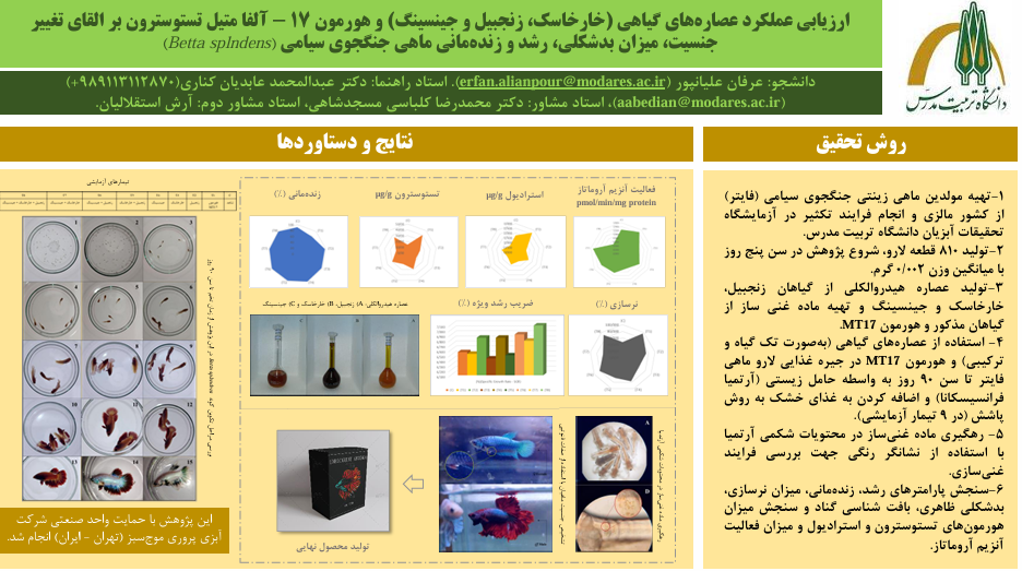 عنوان پایان نامه: ارزیابی عملکرد عصاره های گیاهی (خارخاسک، زنجبیل و جنسینگ) و هورمون 17-آلفا متیل تستوسترون بر القای تغییر جنسیت، میزان بدشکلی، رشد و زنده مانی ماهی جنگجوی سیامی(Betta splendens)