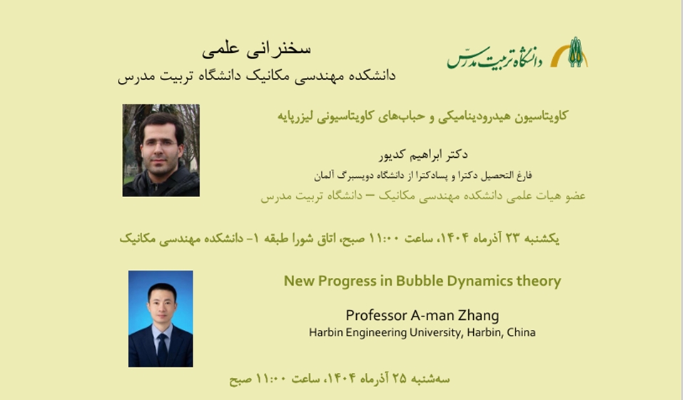 در این راستا سخنرانی دکتر ابراهیم کدیور با عنوان «کاویتاسیون هیدرودینامیکی و حباب های کاویتاسیونی لیزرپایه» یکشنبه ۲۳ آذر ساعت ۱۱ در محل اتاق شورای دانشکده در طبقه منفی یک برگزار می شود. همچنین سخنرانی پروفسور ژانگ با عنوان «New Progress in Bubble Dynamics theory » سه شنبه ۲۵ آذر ساعت ۱۱ به صورت مجازی از طریق لینک زیر برگزار می شود.