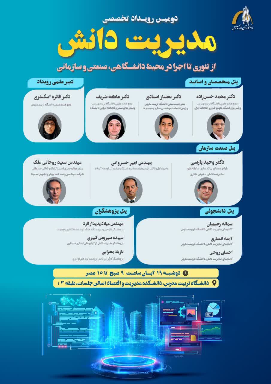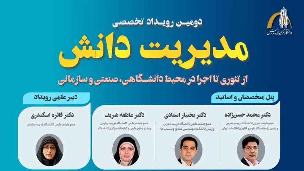 دومین رویداد تخصصی مدیریت دانش؛ از تئوری تا اجرا در محیط دانشگاهی، صنعتی و سازمانی ۱۹ آبان ۱۴۰۴ در دانشگاه تربیت مدرس برگزار می شود.