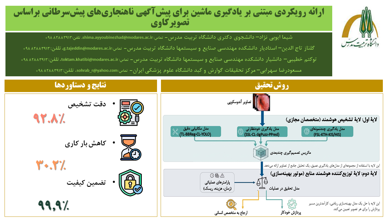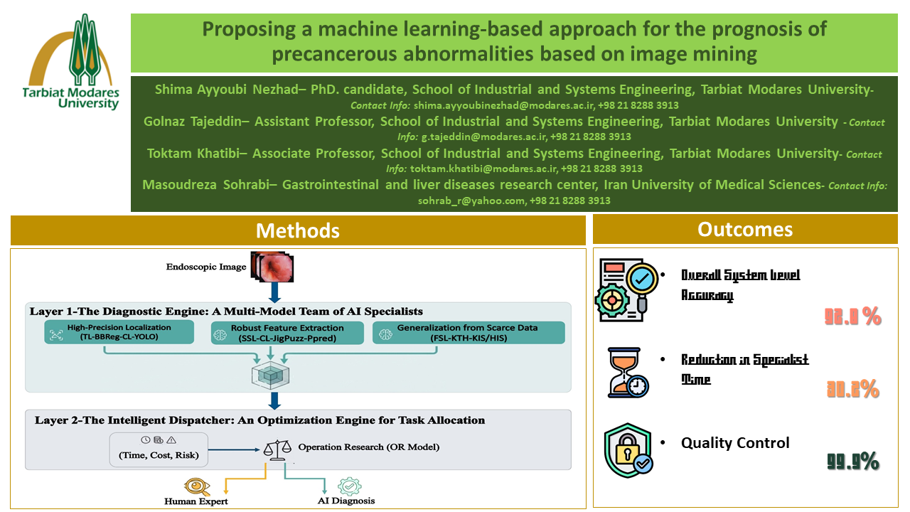 تحلیل تصاویر آندوسکوپی فوقانی، به عنوان یک فرآیند تشخیصی حیاتی، با چالشهای عملیاتی از جمله تخصیص بهینه منابع تخصصی محدود (پزشکان)، نرخ خطای انسانی، و عدم قطعیت ذاتی در دادههای پیچیده مواجه است. این پژوهش با بهکارگیری رویکرد مهندسی سیستمها و تحقیق در عملیات، به طراحی و پیادهسازی یک سامانه توزیع ترکیبی انسان و هوش مصنوعی (HADS) پرداخته است که هدف آن بهینهسازی همزمان کیفیت تشخیص، کارایی عملیاتی و بهرهوری منابع در یک چارچوب خدمات بهداشتی است. در لایه اول این چارچوب، با استفاده از مدیریت زنجیره تأمین داده و کنترل کیفیت آماری، سه مدل یادگیری عمیق تخصصی (مکانیابی، خودنظارتی، چند نمونهای) به عنوان ایستگاههای پردازشی موازی طراحی شدند که خروجیهای آنها همراه با شاخصهای ریسک، اطمینان و پیچیدگی، موجودی اطلاعاتی سیستم را تشکیل میدهند. در هسته مرکزی سیستم، یک مدل بهینهسازی ریاضی چندهدفه مبتنی بر نظریه تصمیمگیری و تخصیص منابع پویا توسعه یافت. این مدل، با در نظر گرفتن قیود عملیاتی (مانند زمان و تخصص)، هر تصویر را بر اساس یک تابع مطلوبیت ترکیبی که کیفیت تشخیص، هزینه خطا و بهرهوری منابع را یکجا کمّیسازی میکند، به بهترین منبع (انسان یا هوش مصنوعی) تخصیص میدهد. حل این مدل با مقدار بهینه ۷۷۹۶.۲۸، طرح بهینه تخصیص کار را ارائه نمود. ارزیابیهای سیستماتیک نشان داد که چارچوب پیشنهادی ضمن دستیابی به دقت تشخیص ۹۲.۸ درصد، با تخصیص 99.9 درصد موارد پرریسک به متخصصان، کیفیت خروجی را تضمین نموده و با تخصیص ۹۸.۱ درصد موارد کمریسک به پردازش خودکار، منجر به کاهش ۳۰.۲ درصد از حجم کار متخصصان (صرفهجویی در زمان و منابع) شد. تحلیل حساسیت و پایداری مدل بهینهسازی، قابلیت اطمینان آن را در شرایط مختلف عملیاتی تأیید کرد. همچنین، شناسایی یک آستانه ریسک بحرانی (2.75) ، امکان طراحی خط مشی تصمیمگیری استاندارد را فراهم ساخت. این مطالعه ثابت کرد که ادغام مهندسی شده مدلهای پیشین با چارچوبهای بهینهسازی تصمیمگیری، میتواند یک سامانه پشتیبان تصمیمگیری عملیاتی کارآمد ایجاد کند که بهبود معنادار در شاخصهای کلیدی عملکرد مانند کیفیت، کارایی و بهرهوری منابع را در یک فرآیند خدماتی پیچیده محقق سازد. چارچوب HADS یک راهحل مهندسی صنایع برای مدیریت هوشمند جریان کار و منابع در محیطهای تشخیص پزشکی ارائه میدهد.