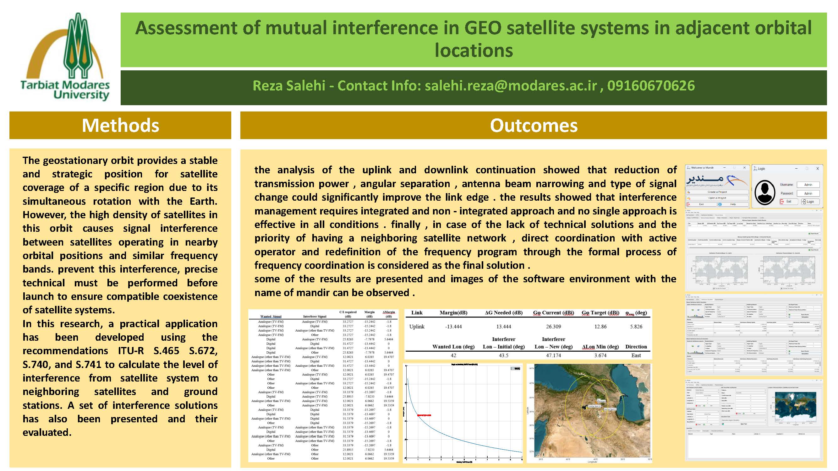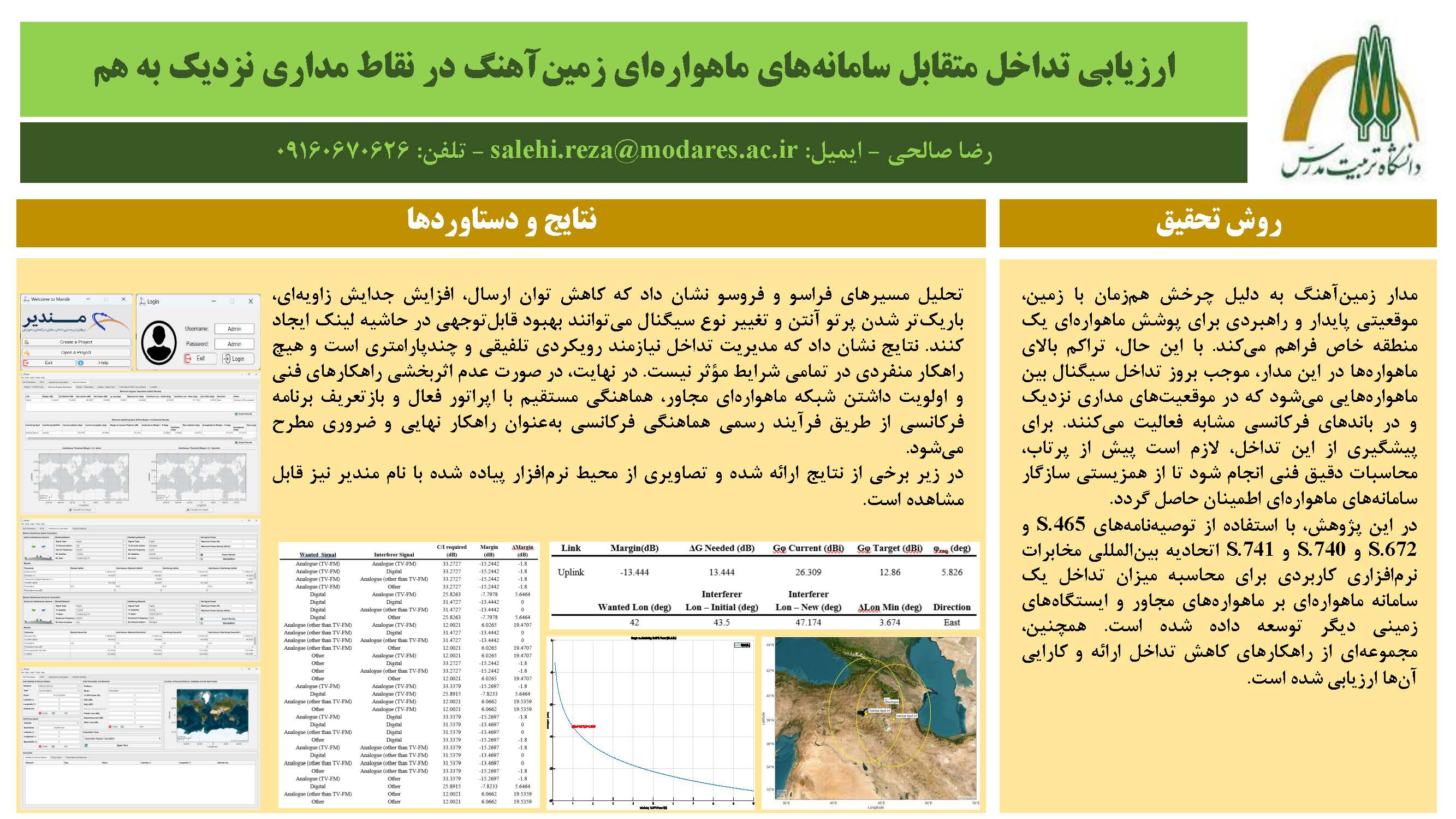 مدار زمینآهنگ به دلیل چرخش همزمان با زمین، موقعیتی پایدار و راهبردی برای پوشش ماهوارهای یک منطقه خاص فراهم میکند. با این حال، تراکم بالای ماهوارهها در این مدار، موجب بروز تداخل سیگنال بین ماهوارههایی میشود که در موقعیتهای مداری نزدیک و در باندهای فرکانسی مشابه فعالیت میکنند. برای پیشگیری از این تداخل، لازم است پیش از پرتاب، محاسبات دقیق فنی انجام شود تا از همزیستی سازگار سامانههای ماهوارهای اطمینان حاصل گردد. در این پژوهش، نرمافزاری کاربردی برای محاسبه میزان تداخل یک سامانه ماهوارهای بر ماهوارههای مجاور و ایستگاههای زمینی دیگر توسعه داده شده است. همچنین، مجموعهای از راهکارهای کاهش تداخل ارائه و کارایی آنها ارزیابی شده است.