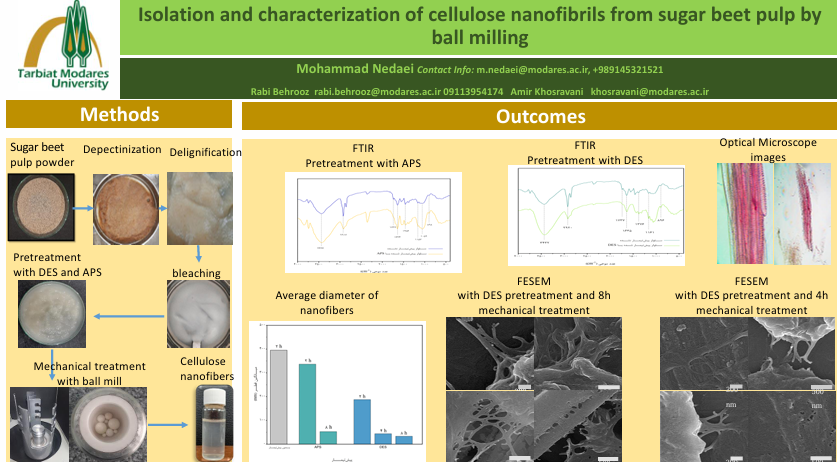 در این پژوهش، الیاف استخراجی از تفاله چغندر قند جهت تولید نانوالیاف سلولزی تحت دو پیش‌تیمار شیمیایی آمونیوم پرسولفات و حلال یوتکتیک عمیق کولین کلراید- اگزالیک اسید و سپس تیمار مکانیکی  با کمک آسیاب گلوله‌ای قرار گرفته است. ویژگی‌های مختلف نانوالیاف تولید شده از جمله ابعاد، مورفولوژی، ساختار کریستالی و شیمیایی آن‌ها، مورد ارزیابی قرار گرفت. نتایج نشان داد که پیش‌تیمارهای شیمیایی علاوه بر حذف ناخالصی‌های باقی‌مانده در الیاف سلولزی شامل لیگنین، پکتین و همی‌سلولزها، قادر به ایجاد واکشیدگی از طریق اصلاح ساختار سلولزی بوده‌اند، که این امر موجب بهبود کارایی آسیاب مکانیکی گردیده است. هم‌چنین، هر دو پیش‌تیمار شیمیایی در ترکیب با تیمار مکانیکی با آسیاب گلوله‌ای دستیابی به نانوفیبریل سلولز را مقدور ساختند. البته، سیستم حلال یوتکتیک عمیق عملکرد بهتری در کاهش قطر نانوالیاف داشته و با استفاده از این سیستم، میانگین قطر 33 نانومتر در مقایسه با 53 نانومتر در مورد اکسایش با آمونیوم پرسولفات به‌دست آمده است. به علاوه بررسی ساختار کریستالی نانوالیاف سلولزی نشان داد که افزایش مدت زمان آسیاب گلوله‌ای منجر به افزایش شاخص کریستالی نانوالیاف گردیده و پیش‌تیمار اکسایش با آمونیوم پرسولفات تاثیر بیشتری بر افزایش کریستالیته داشته است.