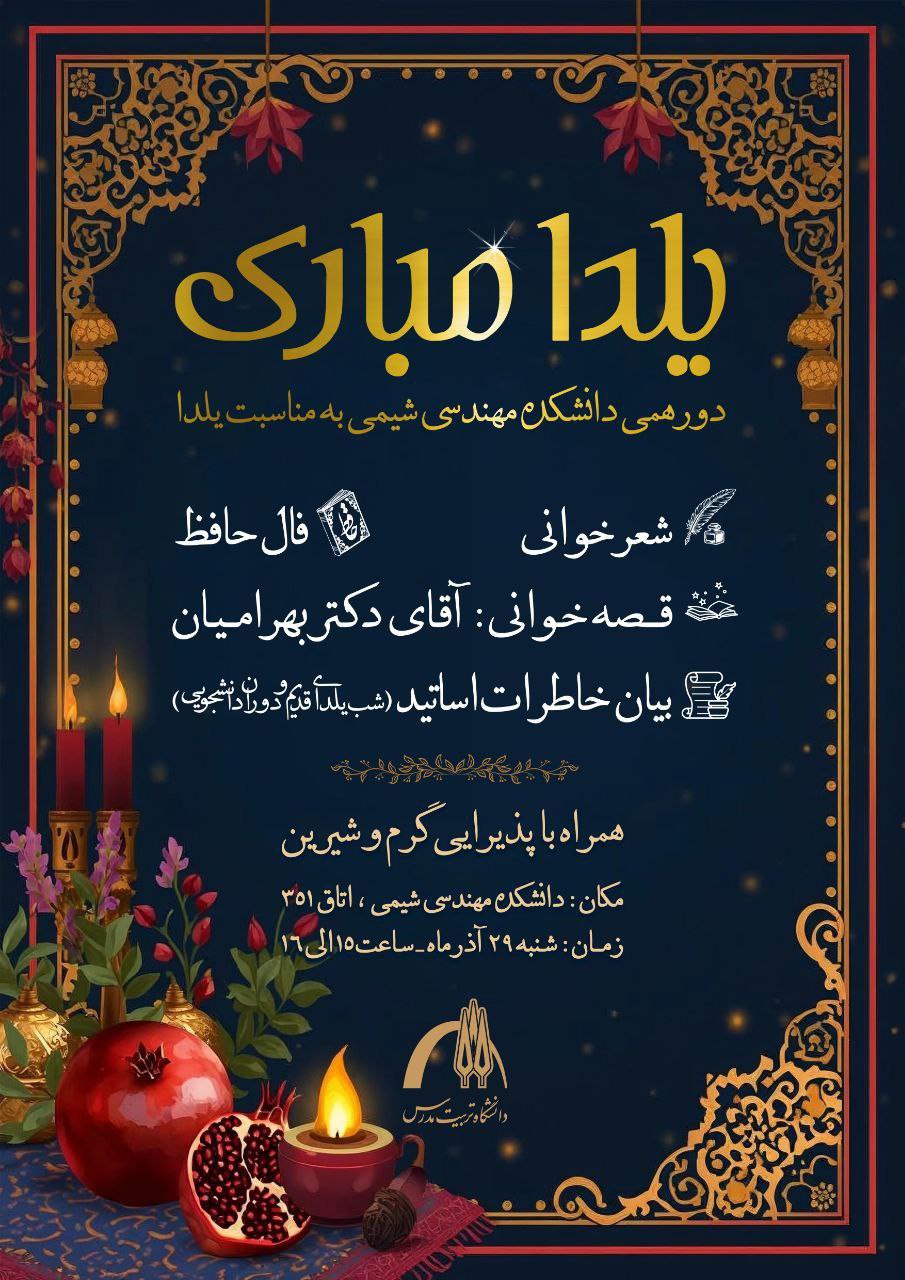 آیین نکوداشت شب یلدا با هدف حفظ سنتهای دیرین و ایجاد فضای پرنشاط علمی و فرهنگی، در تاریخ ۲۹ آذرماه در دانشکده مهندسی شیمی برگزار شد.