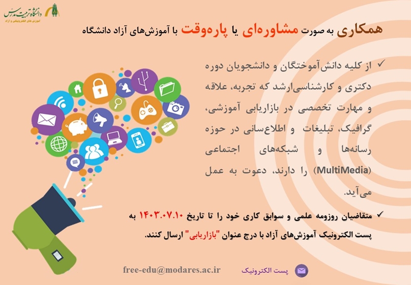 از کلیه دانش آموختگان و دانشجویان دوره دکتری و کارشناسی ارشد که تجربه، علاقه و مهارت تخصصی در بازاریابی آموزشی، گرافیک، تبلیغات و اطلاع سانی در حوزه رسانه ها و شبکه های اجتماعی (MultiMedia) را دارند، دعوت به عمل می آید.