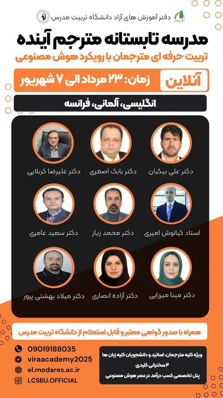 دفتر آموزش‌های آزاد دانشگاه تربیت مدرس، مدرسه تابستانه مترجم آینده؛ تربیت حرفه‌ای مترجمان با رویکرد هوش مصنوعی را به صورت برخط برگزار می‌کند.