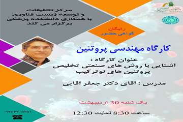 مرکز تحقیقات و توسعه زیست فناوری با همکاری دانشکده علوم پزشکی دانشگاه، کارگاه مهندسی پروتئین با عنوان « آشنایی با روش‌های صنعتی تخلیص پروتئین‌های نوترکیب» را برگزار می‌کند. کارگاه مذکور به مدرسی دکتر جعفر آقایی روز یکشنبه ۳۰ اردیبهشت ماه جاری از ساعت ۸:۳۰ تا ۱۲:۳۰ در سالن سمینار ساختمان پیش ساخته علوم پزشکی برگزار می‌شود. گفتنی است حضور در این کارگاه رایگان است و به شرکت کنندگان گواهی حضور تعلق می‌گیرد.