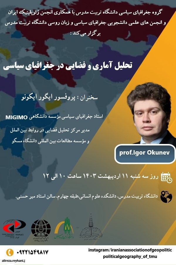 گروه جغرافیای سیاسی دانشکده علوم انسانی با همکاری انجمن ژئوپلیتیک ایران و انجمن‌های علمی-دانشجویی جغرافیای سیاسی و زبان روسی دانشگاه، جلسه سخنرانی « تحلیل آماری و فضایی در جغرافیای سیاسی» را با حضور پروفسور ایگور ایکونو از کشور روسیه برگزار می‌کنند. جلسه سخنرانی مذکور روز سه شنبه ۱۱ اردیبهشت ماه جاری از ساعت ۱۰ تا ۱۲ در سالن استاد میرحسنی دانشکده علوم انسانی برگزار می‌شود.