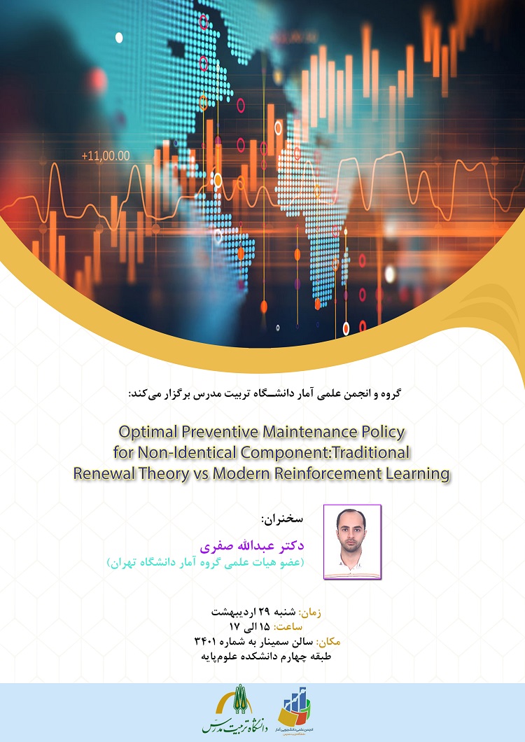 گروه و انجمن علمی دانشجویی آمار جلسه سخنرانی علمی با موضوع Optimal Preventive Maintenace Policy for Non-identical Component با سخنرانی دکتر عبدالله صفری عضو هیأت علمی دانشگاه تهران را روز شنبه ۲۹ اردیبهشت ماه جاری از ساعت ۱۵ تا ۱۷ در سالن سمینار دانشکده علوم ریاضی (۳۴۰۱) برگزار میکند.