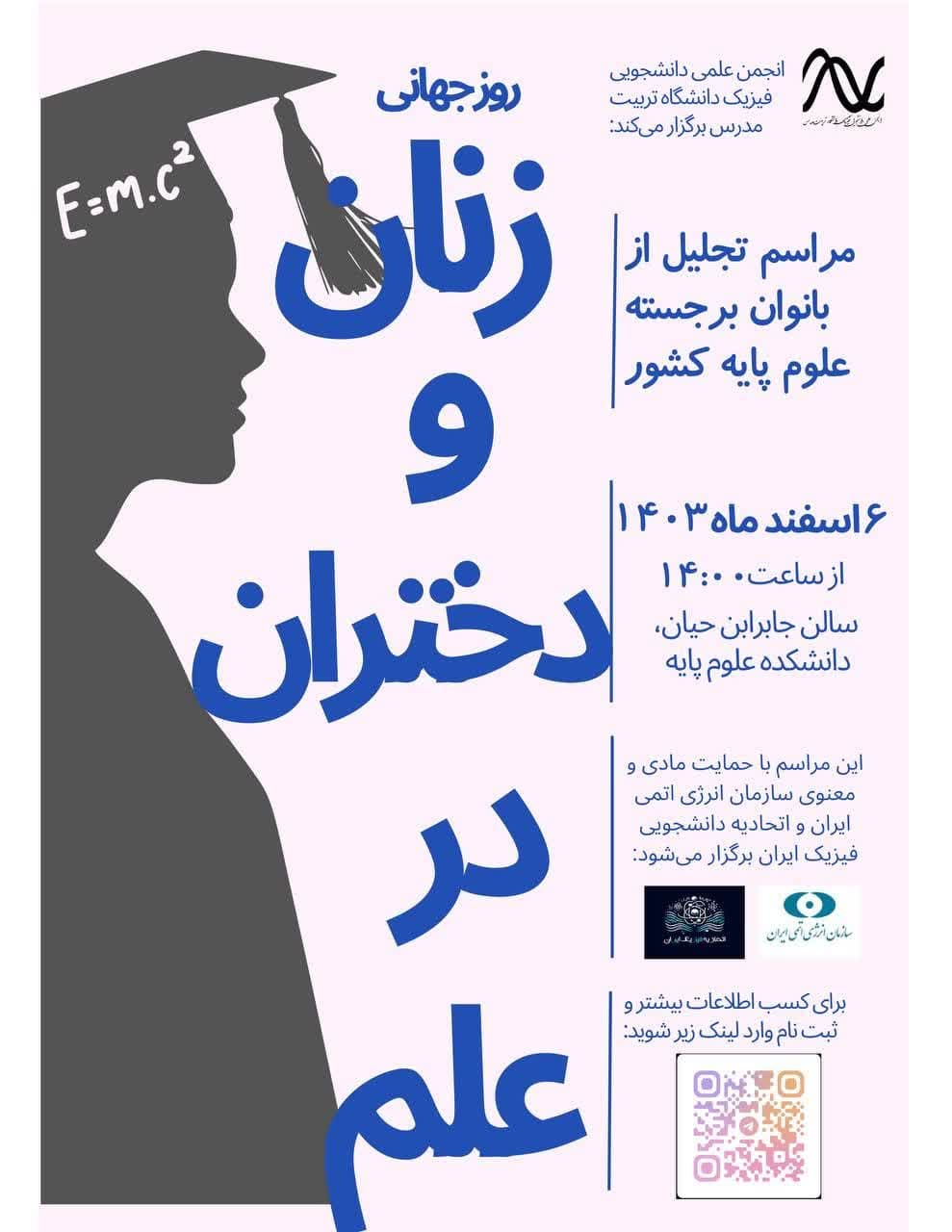 به مناسبت روز جهانی زنان و دختران در علم، انجمن علمی دانشجویی فیزیک دانشگاه تربیت مدرس مراسم تجلیل از بانوان برجسته علوم پایه کشور را روز دوشنبه ۶ اسفندماه از ساعت ۱۴ برگزار می‌کند. در این رویداد که با هدف ارتقاء دسترسی و مشارکت کامل و برابر زنان و دختران در زمینه‌ های علمی برگزار می‌ شود، ضمن معرفی و سخنرانی بانوان برجسته فیزیک کشور، از موفقیت‌ های آنها در پیشبرد اهداف علمی و پژوهشی تقدیر می‌ گردد. گفتنی است روز جهانی زنان و دختران در علم، جشن و رویدادی سالانه است که توسط مجمع عمومی سازمان ملل متحد در تاریخ ۱۱ فوریه هر سال برگزار می‌ شود.   جهت ثبت‌ نام رایگان در این مراسم اینجا کلیک کنید
