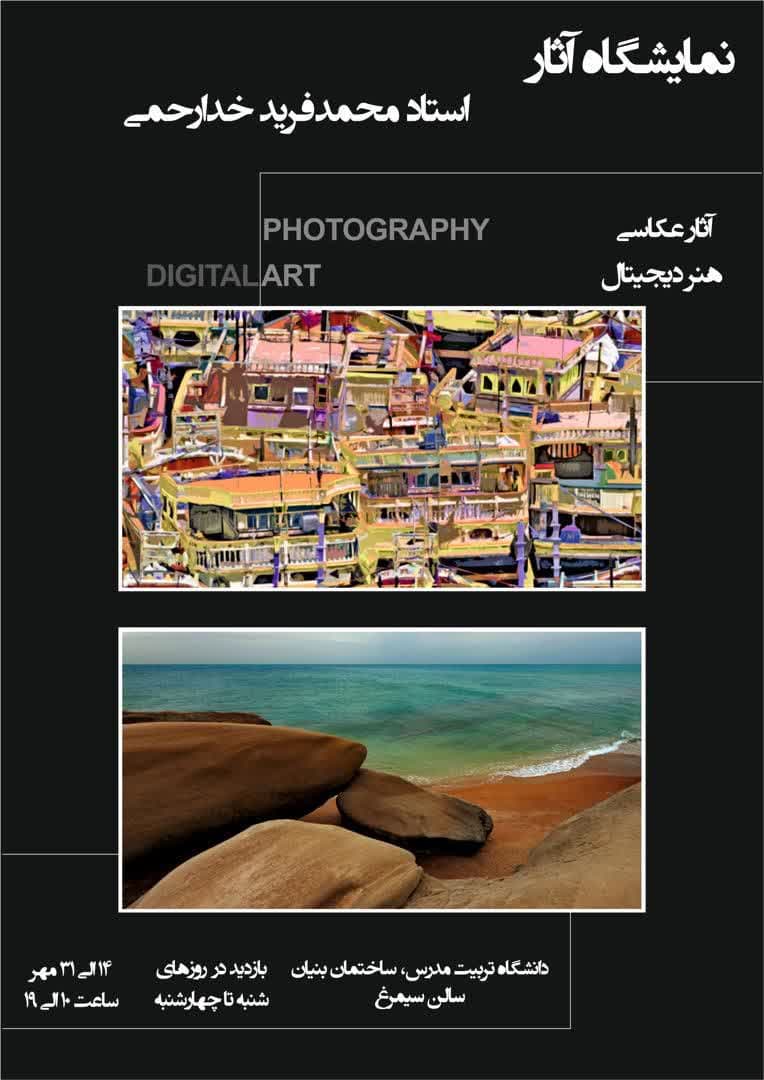 نمایشگاه آثار عکاسی و هنر دیجیتال استاد خدارحمی از شنبه ۱۴ مهر تا چهارشنبه ۳۱ مهر ماه ۱۴۰۳ از ساعت ۱۰ تا 19 در سالن سیمرغ ساختمان بنیان برگزار میشود.