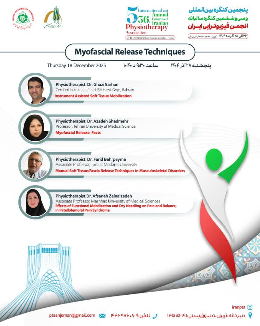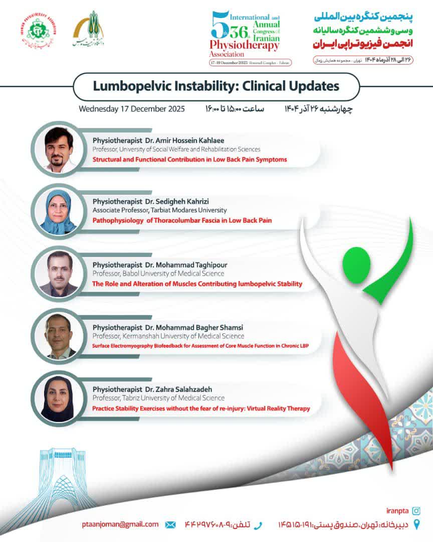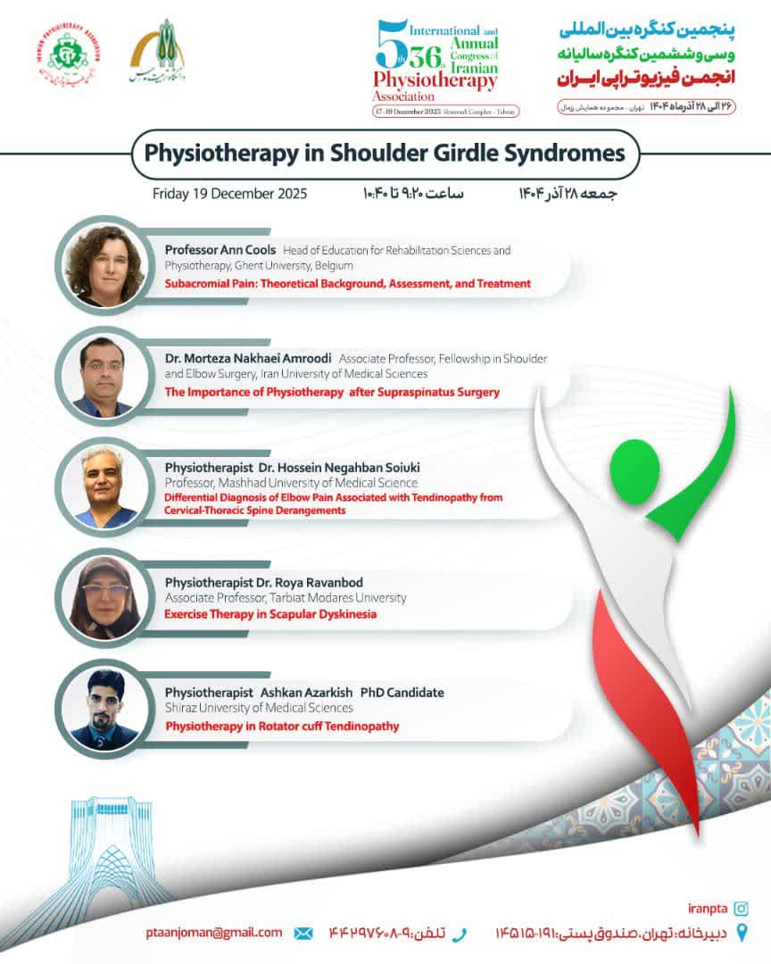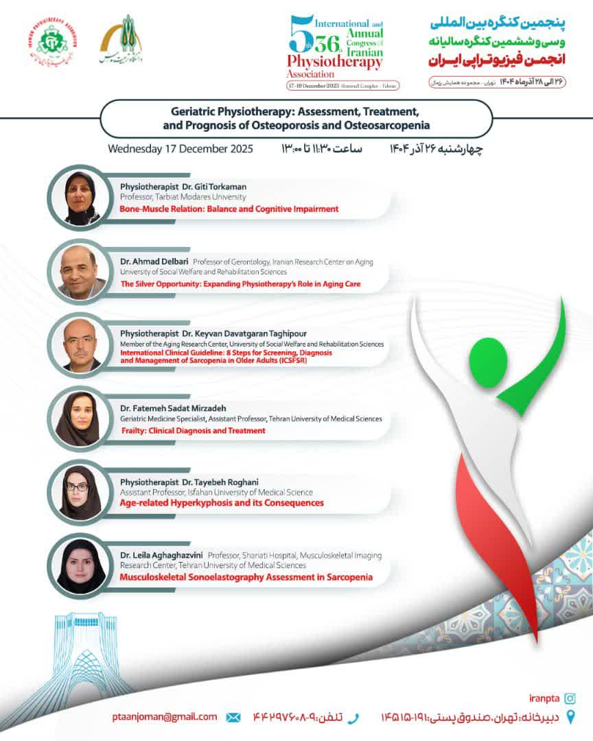 پنجمین کنگره بین المللی و سی و ششمین کنگره سالیانه فیزیوتراپی توسط انجمن فیزیوتراپی ایران و با همکاری دانشگاه تربیت مدرس در تاریخ ۲۶تا ۲۸ آذر ماه در مجموعه همایش رزمال برگزار می شود.