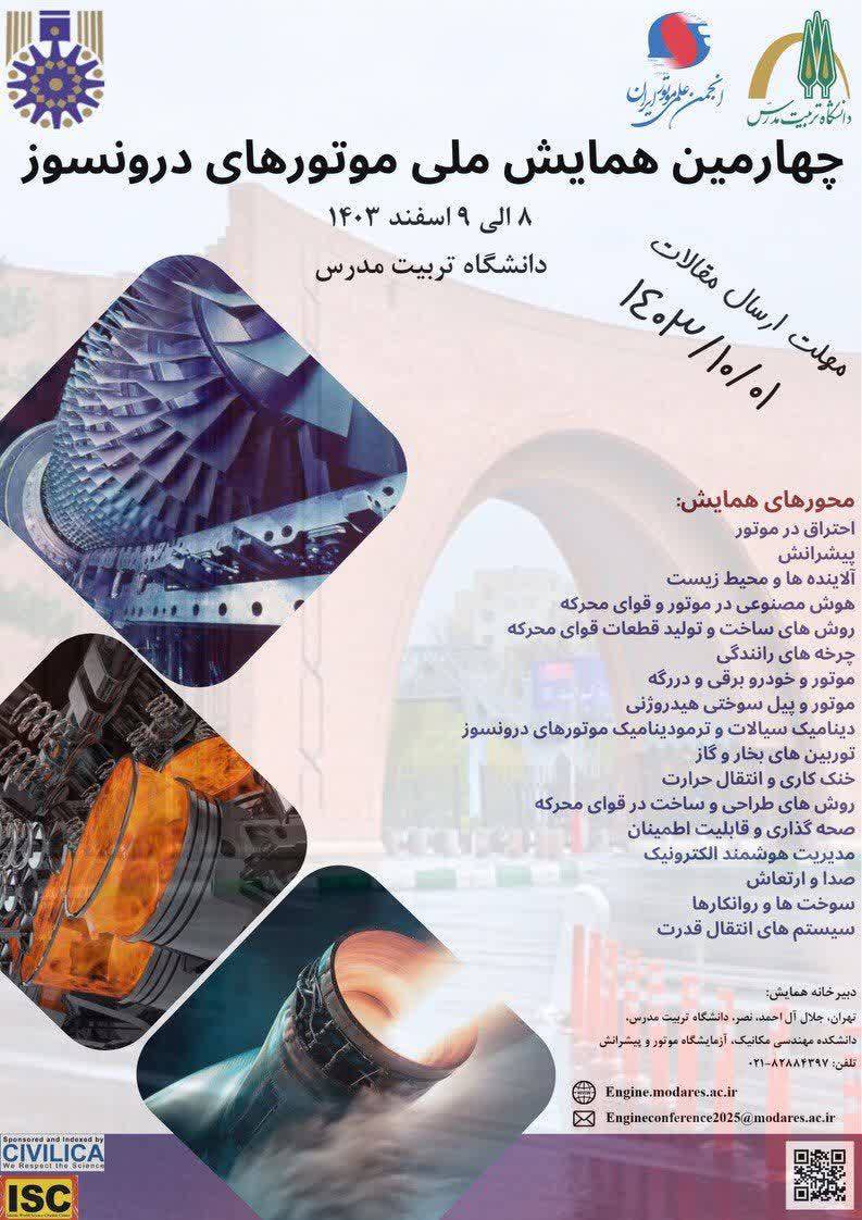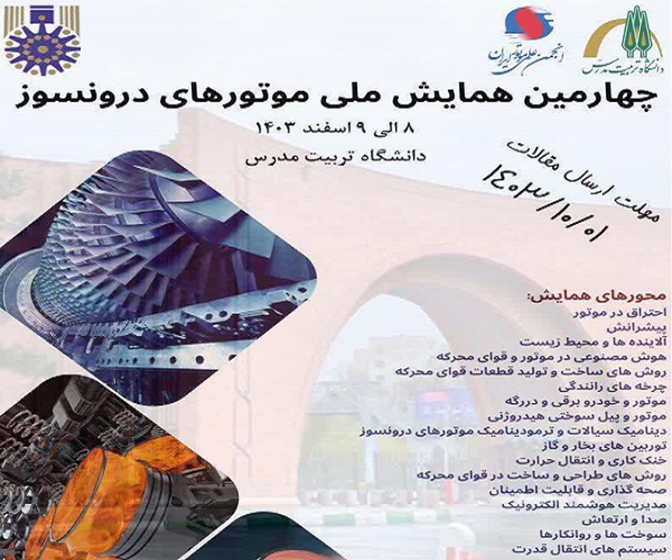 چهارمین همایش ملی موتورهای درونسوز در دانشگاه تربیت مدرس حول محورهای: احتراق در موتور، پیشرانش، آلاینده‌ ها و محیط زیست، هوش مصنوعی در موتور و قوای محرکه، روش‌ های ساخت و تولید قطعات قوای محرکه، چرخه‌ های رانندگی، موتور و خودروی برقی و دررگه، موتور و پیل سوختی هیدروژنی، دینامیک سیالات و ترمودینامیک موتورهای درونسوز، توربین‌ های بخار و گاز، خنک‌ کاری و انتقال حرارت، روش‌ های طراحی و ساخت در قوای محرکه، صحه گذاری و قابلیت اطمینان، مدیریت هوشمند الکترونیک، صدا و ارتعاش، سوخت‌ ها و روانکارها، سیستم‌ های انتقال قدرت ۸ و ۹ اسفند ماه سال جاری  در دانشگاه تربیت مدرس برگزار می‌شود.