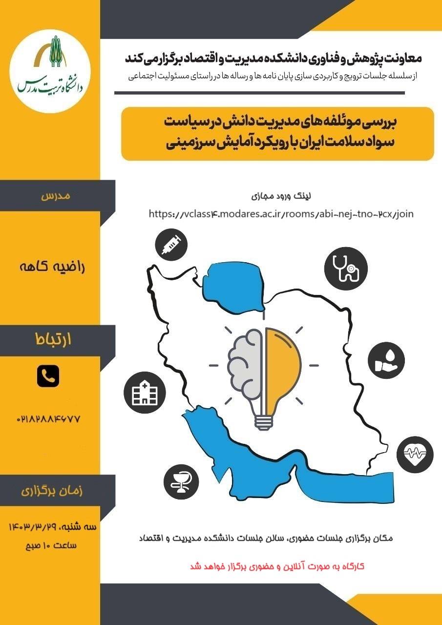 کارگاه «بررسی مؤلفه‌های مدیریت دانش در سیاست سواد سلامت ایران، با رویکرد آمایش سرزمین» 29 خرداد 1403 در دانشکده مدیریت و اقتصاد برگزار می شود.