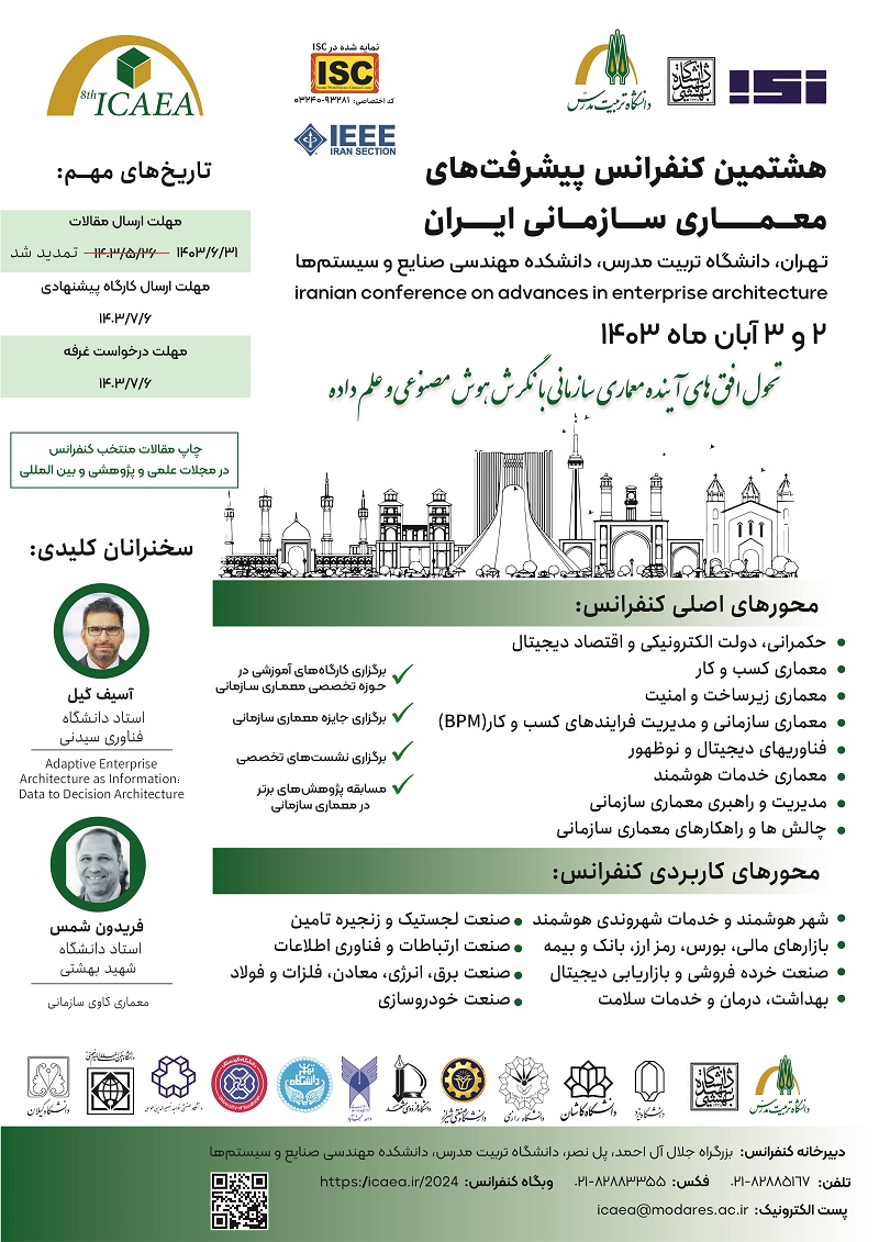 هشتمین کنفرانس پیشرفت های معماری سازمانی ایران، 2 و 3 آبان ماه 1403 به میزبانی دانشکده مهندسی صنایع و سیستم‌های دانشگاه تربیت مدرس برگزار می شود.