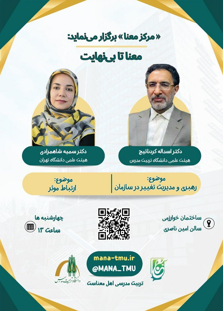 ترم اول و دوم رویداد حضوری معرفتی-تخصصی «از معنا تا بی نهایت» با حضور اساتید برجسته با محوریت رهبری و مدیریت تغییر در سازمان و ارتباط موثر، از ۱۶ آبان ماه جاری آغاز میشود.