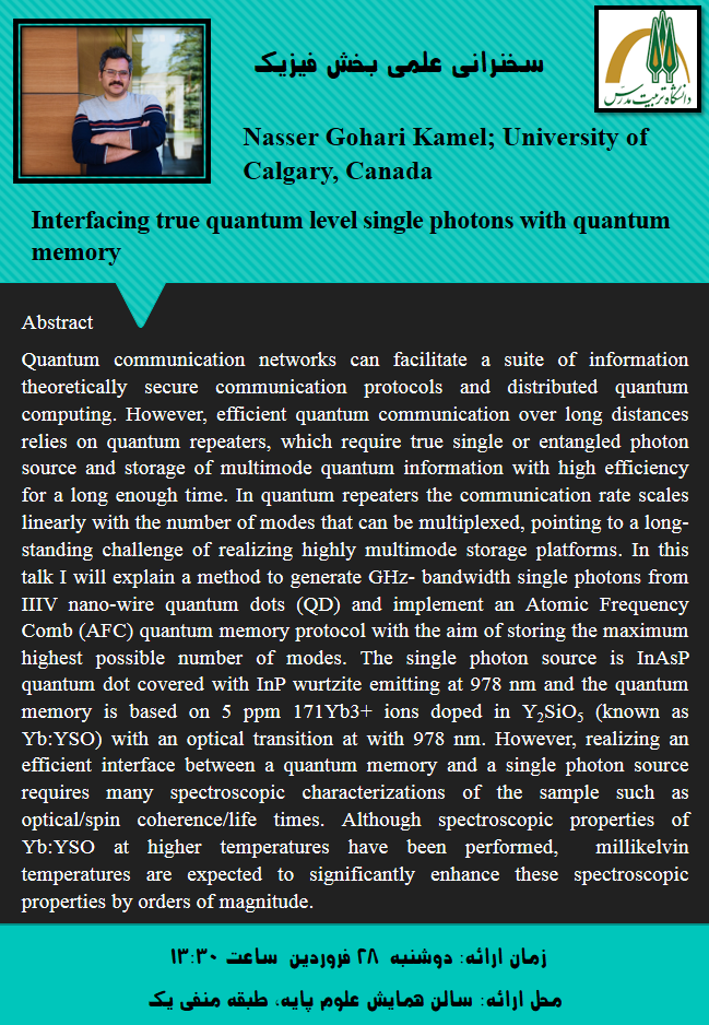 جلسه سخنرانی علمی بخش فیزیک با عنوان «نقش تک فوتونهای کاملا کوانتومی در حافظههای کوانتومی» با سخنرانی ناصر گوهری کامل از دانشگاه کلگری کانادا دوشنبه ۲۸ فروردین ماه جاری از ساعت ۱۳:۳۰ در سالن همایش دانشکده علوم پایه واقع در طبقه منفی یک برگزار خواهد شد.