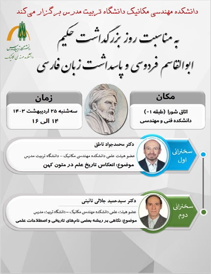 به مناسبت روز بزرگداشت حکیم ابوالقاسم فردوسی و پاسداشت زبان فارسی 25 اردیبهشت 1403 نشستی در دانشکده مهندسی مکانیک برگزار می شود.