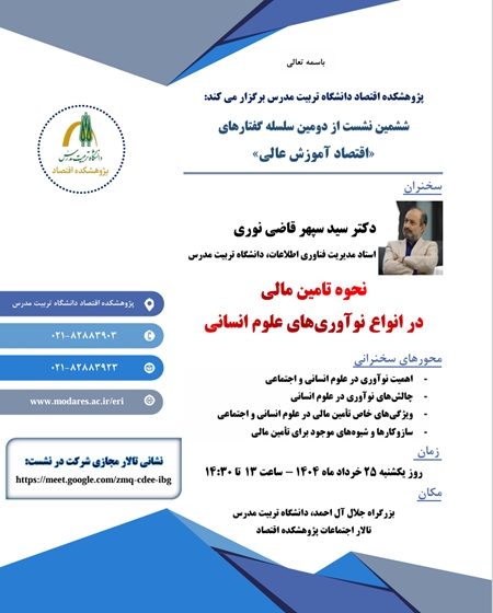 پژوهشکده اقتصاد دانشگاه تربیت مدرس ششمین نشست از دومین دوره سلسله گفتارهای «اقتصاد آموزش عالی» را با عنوان «نحوه تأمین مالی در انواع نوآوری های علوم انسانی» ۲۵ خرداد ماه جاری برگزار می کند.این نشست تخصصی با سخنرانی دکتر سید سپهر قاضی نوری استاد مدیریت فناوری اطلاعات دانشگاه حول محورهای: اهمیت نوآوری در علوم انسانی و اجتماعی، چالش های نوآوری در علوم انسانی، ویژگی های خاص تأمین مالی در علوم انسانی و اجتماعی، سازوکارها و شیوه های موجود برای تأمین مالی روز یکشنبه ۲۵ خرداد از ساعت ۱۳ تا ۱۴:۳۰ در سالن اجتماعات پژوهشکده اقتصاد دانشگاه تربیت مدرس برگزار می شود.