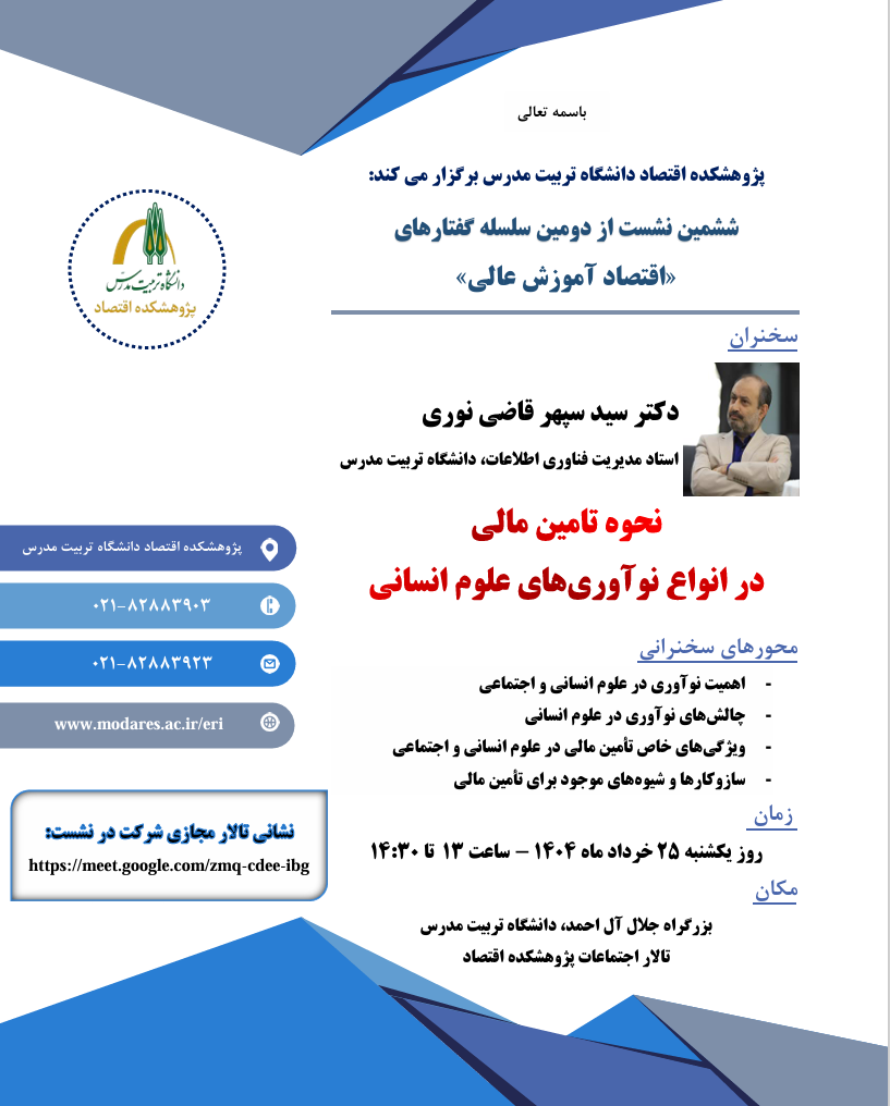 پژوهشکده اقتصاد دانشگاه تربیت مدرس ششمین نشست از دومین دوره سلسله گفتارهای «اقتصاد آموزش عالی» را با عنوان «نحوه تأمین مالی در انواع نوآوری های علوم انسانی» ۲۵ خرداد ماه جاری برگزار می کند.این نشست تخصصی با سخنرانی دکتر سید سپهر قاضی نوری استاد مدیریت فناوری اطلاعات دانشگاه حول محورهای: اهمیت نوآوری در علوم انسانی و اجتماعی، چالش های نوآوری در علوم انسانی، ویژگی های خاص تأمین مالی در علوم انسانی و اجتماعی، سازوکارها و شیوه های موجود برای تأمین مالی روز یکشنبه ۲۵ خرداد از ساعت ۱۳ تا ۱۴:۳۰ در سالن اجتماعات پژوهشکده اقتصاد دانشگاه تربیت مدرس برگزار می شود.
