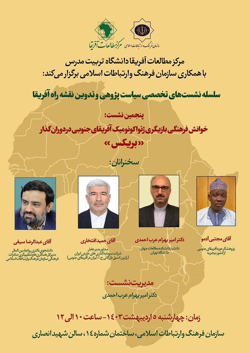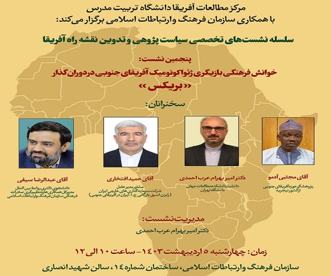 مرکز مطالعات آفریقای دانشگاه تربیت مدرس با همکاری سازمان فرهنگ و ارتباطات پنجمین نشست از سلسله نشست های تخصصی « سیاست پژوهی و تدوین نقشه راه آفریقا» با عنوان : خوانش فرهنگی بازیگری ژئواکونومیک آفریقای جنوبی در دوران گذار« بریکس » را روز چهار شنبه 5 اردیبهشت ۱۴۰۳ برگزار می کند.
