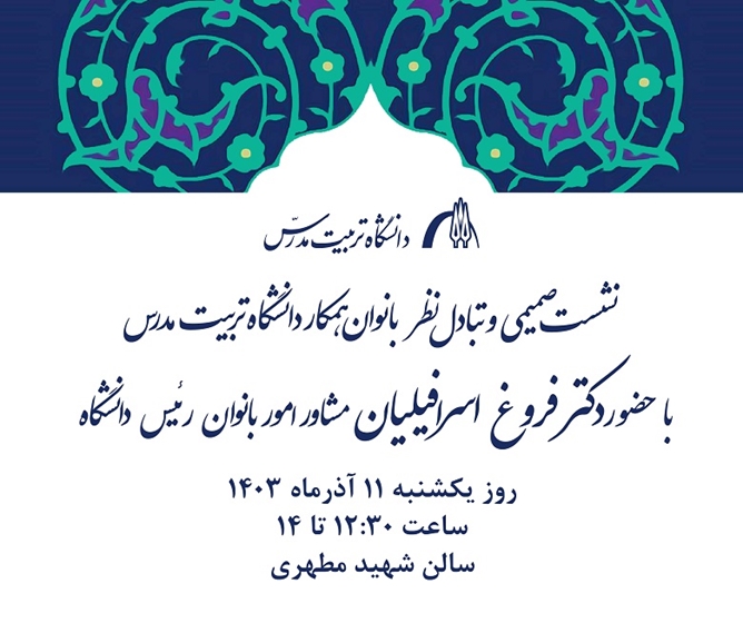 نشست صمیمی و تبادل نظر بانوان همکار دانشگاه با دکتر فروغ اسرافیلیان  مشاور رئیس دانشگاه در امور زنان و خانواده روز یکشنبه ۱۱ آذر ماه از ساعت ۱۲:۳۰ تا ۱۴ در سالن اجتماعات شهید مطهری برگزار می‌شود.