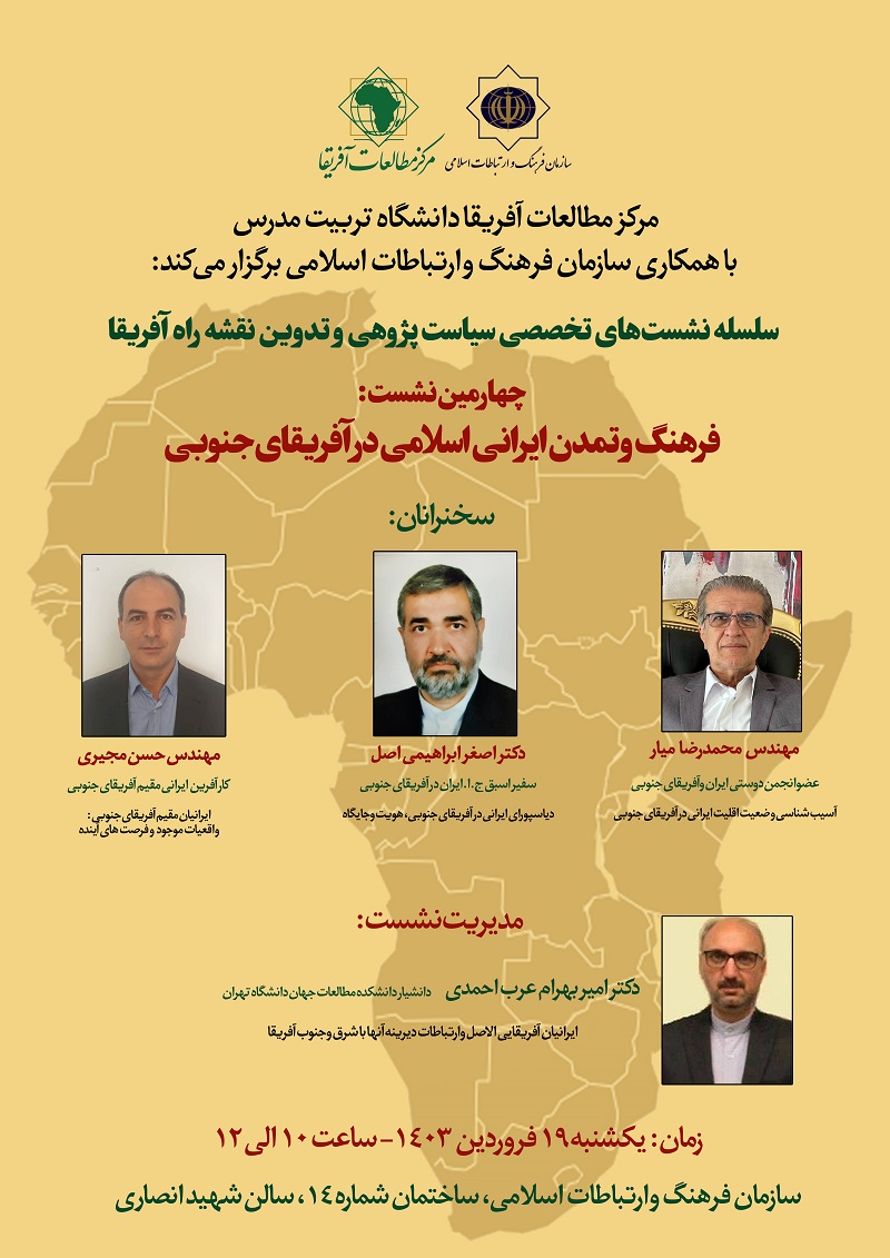 مرکز مطالعات آفریقای دانشگاه تربیت مدرس با همکاری سازمان فرهنگ و ارتباطات چهارمین نشست از سلسله نشست های تخصصی « سیاست پژوهی و تدوین نقشه راه آفریقا» با عنوان «فرهنگ و تمدن ایرانی اسلامی در آفریقای جنوبی» را روز یکشنبه ۱۹ فروردین ۱۴۰۳ برگزار می کند.