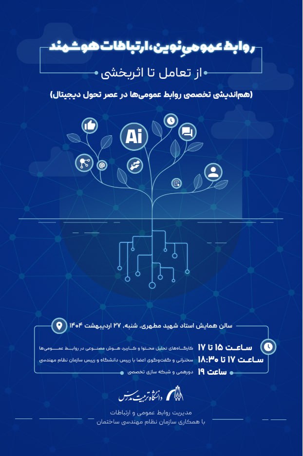 به مناسبت روز روابط عمومی و ارتباطات، هم‌اندیشی تخصصی روابط عمومی‌ها در عصر تحول دیجیتال، شنبه ۲۷ اردیبهشت ۱۴۰۴ در سالن همایش شهید مطهری برگزار می‌شود.این مراسم در دو بخش کارگاه‌های تخصصی و هم اندیشی از ساعت ۱۵ تا ۱۹ برگزار خواهد شد.کارگاه های تحلیل محتوا و کاربرد هوش مصنوعی در روابط عمومی ها با سخنرانی و ارائه دکتر سبحان یحیایی هیات علمی دانشکده علوم ارتباطات دانشگاه علامه طباطبایی و عضو هیات مدیره انجمن ایرانی مطالعات فرهنگی و ارتباطات و علی شاکر دکتری ارتباطات، مدرس دانشگاه و پژوهشگر حیطه هوش مصنوعی ساعت ۱۵ تا ۱۷ برگزار می‌شود. سخنرانی و گفت‌وگوی اعضا با رئیس دانشگاه و رئیس سازمان نظام مهندسی (ساعت ۱۷ تا ۱۸:۳۰) و  دورهمی و شبکه سازی تخصصی (ساعت ۱۹) از جمله دیگر برنامه‌های این رویداد است.