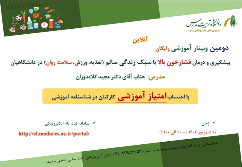 دفتر آموزش های آزاد دانشگاه، وبینار رایگان «پیشگیری و درمان فشارخون بالا با سبک زندگی سالم (تغذیه، ورزش، سلامت روان) در دانشگاهیان» را به صورت آنلاین برگزار می کند.