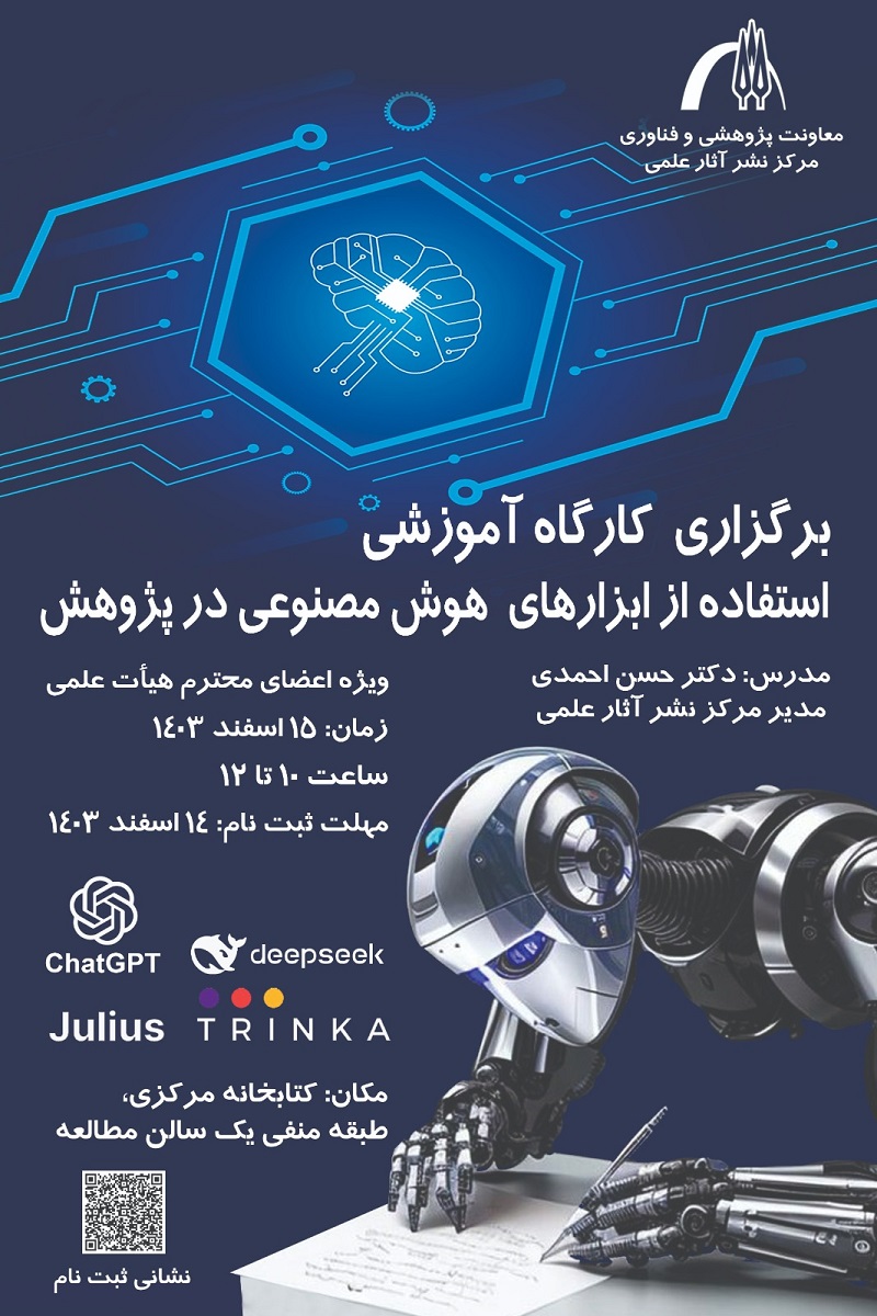 مدیریت پژوهش و نوآوری دانشگاه، کارگاه 'استفاده از ابزارهای هوش مصنوعی در پژوهش' را روز چهارشنبه 15 اسفند ماه 1403 برگزار می کند.