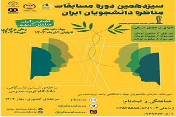 مرحله استانی/ دانشگاهی سیزدهمین دوره مسابقات مناظره دانشجویی با شعار « تضارب آرا، ساختن آینده» دی ماه ۱۴۰۳ برگزار می‌شود. دانشجویان می‌ توانند با تشکیل تیم‌ های چهار نفره در این رویداد دانشجویی شرکت کرده و با هم در یک محیط سالم و دانشگاهی در موضوعات مختلف فرهنگی، اجتماعی، سیاسی و اقتصادی به رقابت بپردازند. مهلت ثبت نام تا پایان آذر ماه و زمان برگزاری مسابقات نیز دی ماه ۱۴۰۳ می‌باشد. به تیم اول این مسابقات   ۷ میلیون تومان، ‌ تیم دوم   ۶ میلیون تومان و تیم سوم نیز ۵ میلیون تومان جایزه تعلق می‌گیرد. همچنین تیم برتر دانشگاه در مرحله استانی به مرحله کشوری مسابقات که در بهار۱۴۰۴ برگزار میشود، ‌ اعزام خواهد شد. به تمامی تیم‌های شرکت کننده «گواهی معتبر شرکت در مسابقات» اعطا می‌گردد. دانشجویان جهت ثبت نام و کسب اطلاعات بیشتر می‌توانند با شماره  ۸۶ الی ۰۲۱۶۶۵۶۵۵۸۵ داخلی ۱۰۳ یا ۰۹۳۹۲۶۶۰۸۰۱ تماس حاصل نمایند.